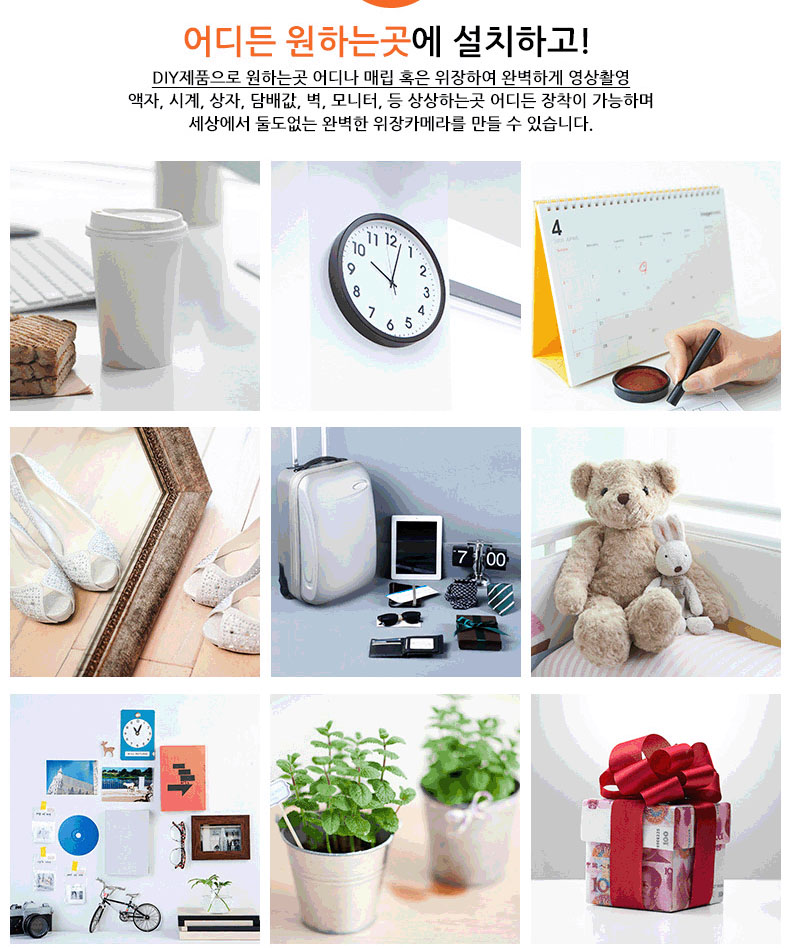 기기 자체를 액자나 책 안 또는 화재경보기나 벽시계 등에 설치할 수 있습니다.