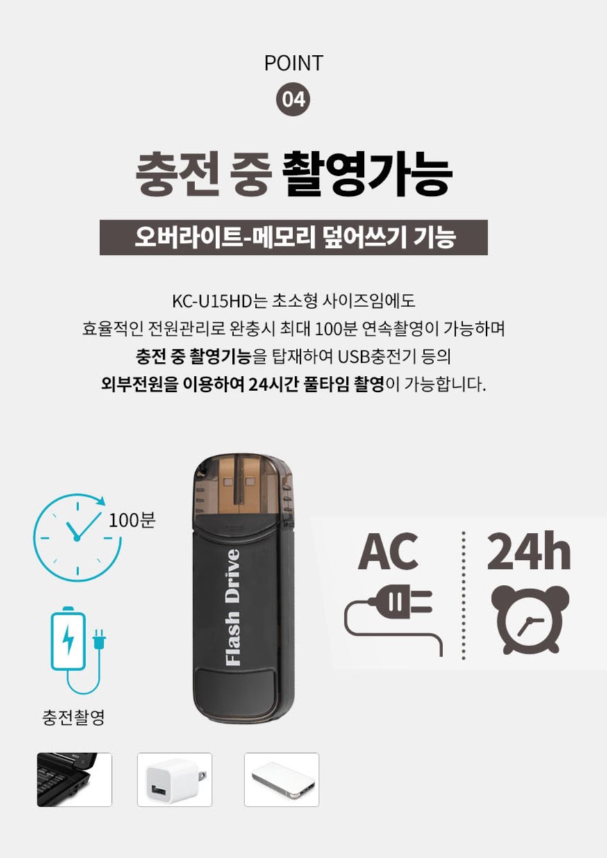 자연스럽게 노트북 USB단자에 꽂아 녹화가 가능하기 때문에 배터리 문제에서 완전히 해방이 됩니다.