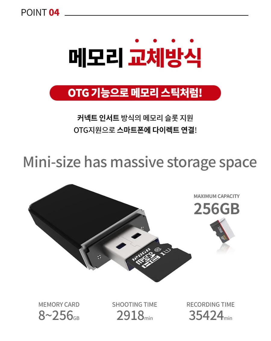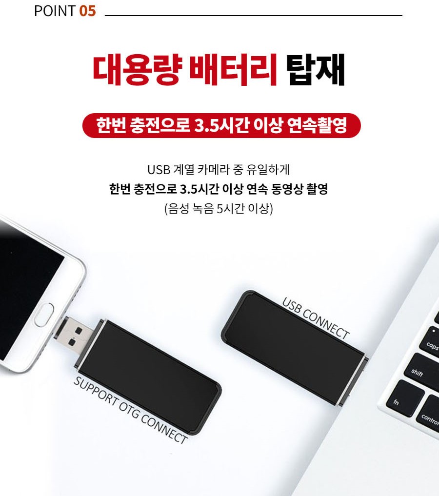 한번 충전으로 장시간 촬,영이 가능하기 때문에 자리를 비워도 증거를 확보하실 수 있습니다.