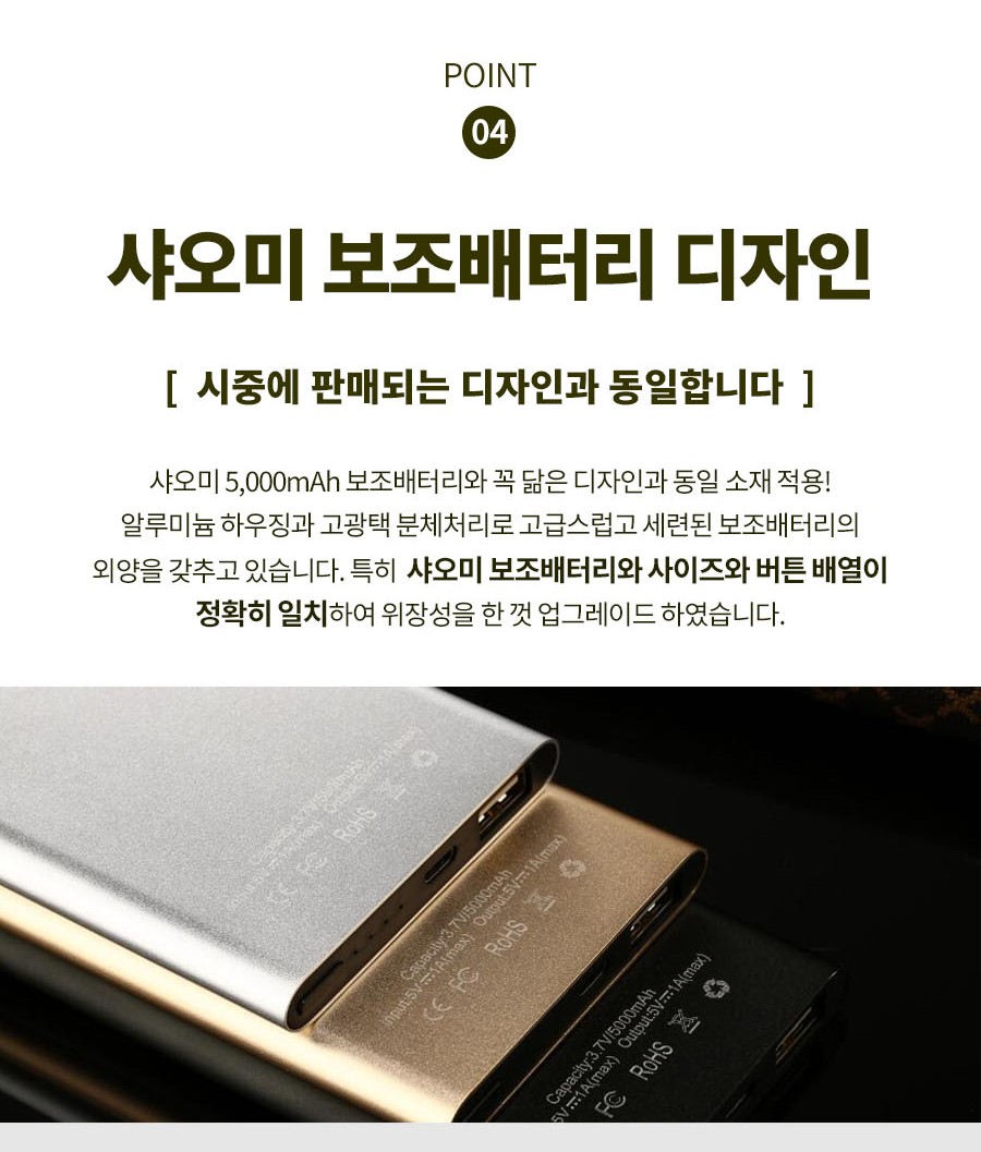흔히 사용하는 샤오미 보조배터리와 동일한 디자인이기 때문에 활용도 면에서 각광을 받는다고 보시면 됩니다.