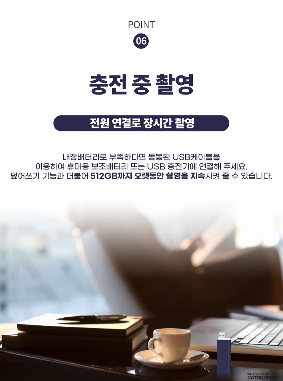 말 그대로 콘센트에 꼽고 배터리 걱정없이 무한으로 녹,화가 가능하기 때문에 cctv대용으로 요긴하게 활용이 가능해요.